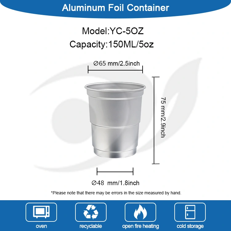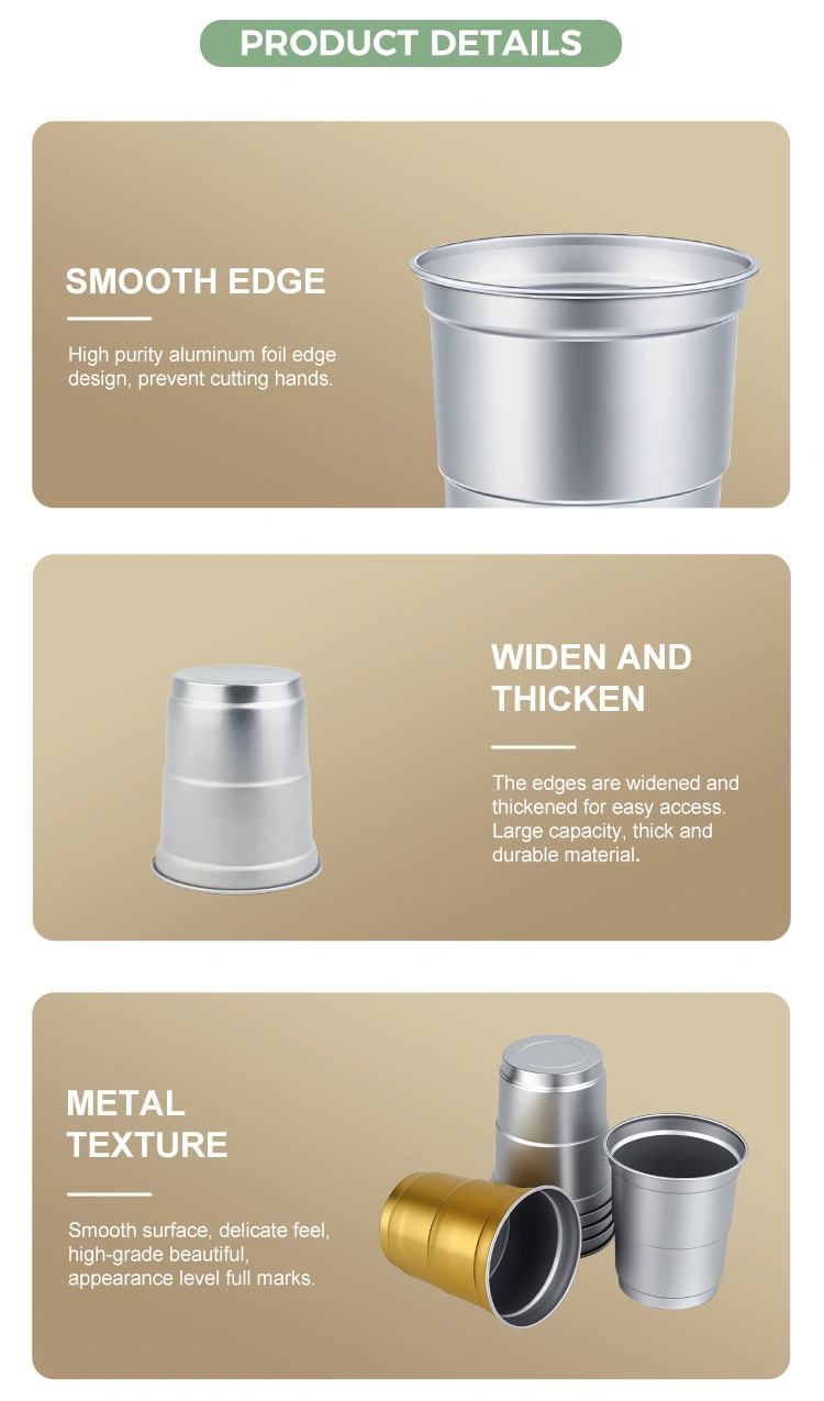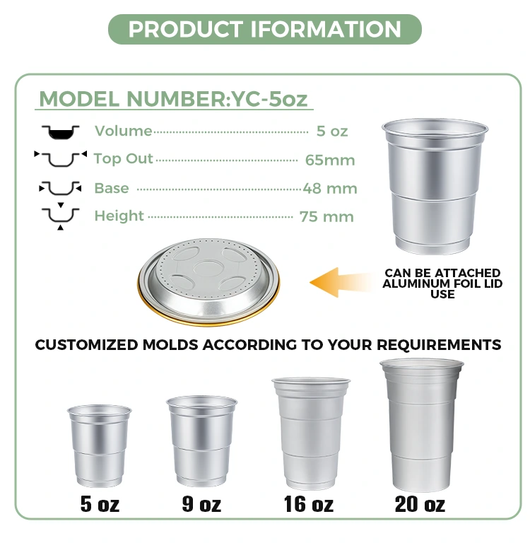 Yunchu alumiiniumfooliumi tarnija 5 untsi ühekordselt taaskasutatav külma joogi alumiiniumist joogitops, millel on lihtne ja elegantne alumiiniumist metallist tekstuur, muudab selle joogitopsi sobivaks paljude stsenaariumide jaoks, hõlmates mitut valdkonda, nagu äritegevused, vabaaja kogunemised, suuremahulised üritused jne, muutudes stsenaariumipõhiste pakendite eelistatud lahenduseks: