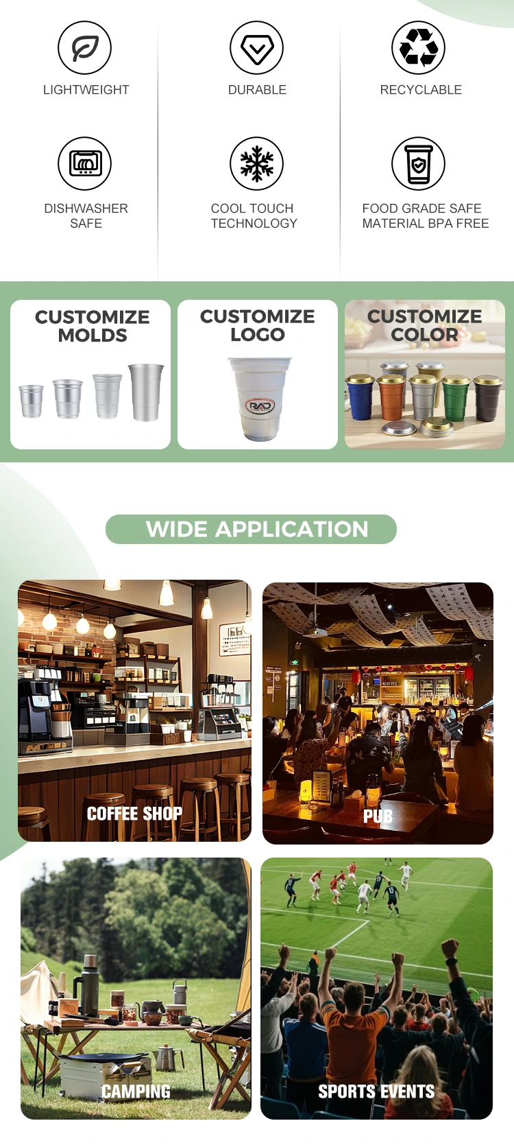 Kaubandustegevuse stsenaariumid: näitused, pressikonverentsid, äriteepausid ja muud sündmused. Seda alumiiniumist tassi saab kasutada selliste jookide nagu mineraalvesi ja mullivesi hoidmiseks. Seda on kerge ja lihtne kaasa võtta ning selle taaskasutatav atribuut sobib ettevõtte rohelise kontori kuvandiga. Seda saab kasutada minikokteilide valmistamiseks, viski hoidmiseks jne baarides ja läbipaistvates baarides. Metallist tassikorpus suudab kiiresti edasi anda jahedust, võimendada jookide jääkülma maitset ning samas lisada ööklubi õhkkonda moekat stiili.