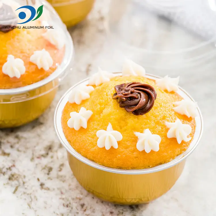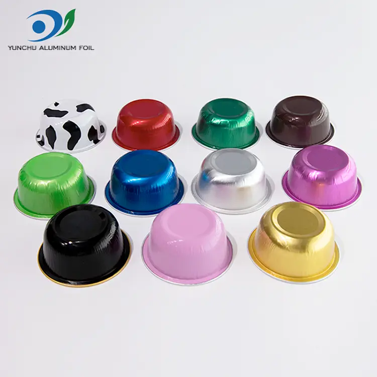Yunchu tehase värvitud ümmarguse röstitud sileda seina alumiiniumfooliumi konteinerid C050 on väike mahutavus 50 ml, mis muudab selle sobivaks kõrge väärtusega väikeste osade pakendamiseks, näiteks Prantsuse vahukommid, šokolaadimoussid, tarretis, piima tarretis ja vahukohtumine. See on ka festivali kinkekarpide ja äri suveniiride tavaline väikese võimsusega konteiner. Seda saab kombineerida mitmesuguste maitsetega, moodustades komplektide seeria, suurendades kingituse üldist väärtust. Toitluskaupluste või küpsetusbrändide jaoks, mis keskenduvad brändikogemusele, aitab see väike alumiiniumfooliumi karikas aidata nende tooteid võistlusel silma paista.