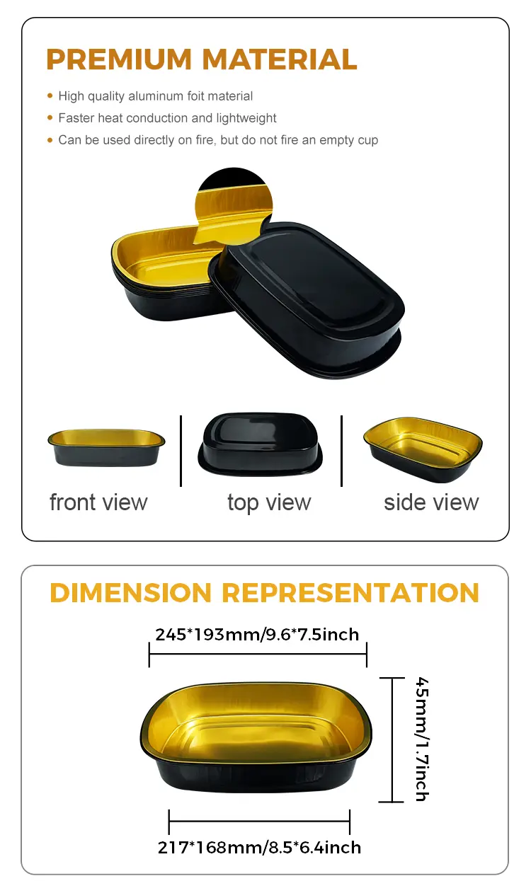 Yunchu alumiiniumfooliumi tarnija ühekordselt kasutatav must kuld küpsetussalv ristkülikukujulised alumiiniumfooliummahutid MF1450 sobib suuremahuliseks toitlustamiseks, eriti sobib sööklate toitlustamiseks, restoranide ketipoodideks ning külmkapis toidu jaotuseks ja muust stsenaariumist, see toode on valmistatud suurest ja tugevast toidust, mis on sobiv, ja see on sobiv, vähese heitga materjaliga, vähese heitkese materjaliga, vähese heitkese materjaliga, vähese heitkese materjaliga. Soojusjuhtivus võib kõrge temperatuuri ühtlaselt hajutada, et tagada toidu ühtlane kuumutamine, hea koormuse kandmise ja survevõimega, tagamaks, et transpordi ajal pole seda lihtne väljapressida ja deformeeruda, seda saab kasutada fooliumi soojus tihendi või plastkaanega.