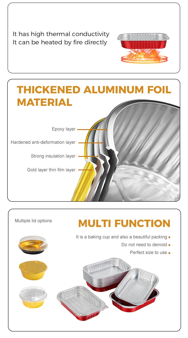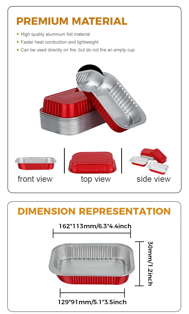 -Ristkülikupunase alumiiniumist väljavõtmise konteineri materjal võib lukustada toidu värskuse ja värskuse. Selle suurepärased soojusjuhtivus- ja isolatsiooniomadused võimaldavad seda otse ahjus, mikrolaineahjus soojendada ja külmkapis jahutada, lukustades tõhusalt toidu algse maitse ja säilitades ideaalse maitse pikka aega.