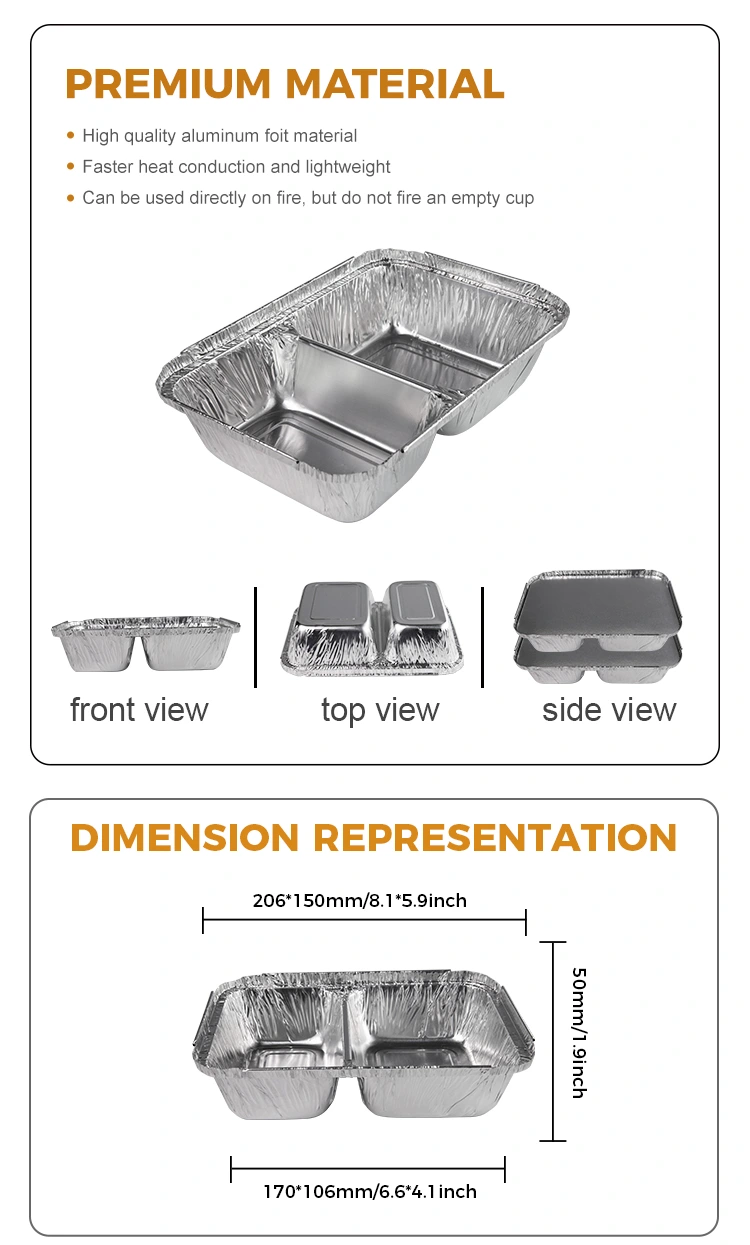Selle ühekordselt kasutatava sektsiooni kiirtoidu hõbedase alumiiniumfooliummahutite avasuurust on lihtne toitu sisse ja välja panna. Toidu serveerimisel võimaldab suurem avamine köögitöötajatel kiiresti ja kvaliteetset praetud roogasid ja muid esemeid sinna sisse valada ning seda on tarbijatel lihtne ka süüa, näiteks söögipulgade või kahvlitega toidu korjamine. See disaini kõrgus võib tagada lõunakasti stabiilsuse, tagades samal ajal piisava toiduvõimaluse ja seda ei saa transpordi või paigutamise ajal liigse kõrguse tõttu hõlpsalt maha, kaitstes tõhusalt sees olevat toitu voolamise eest.
