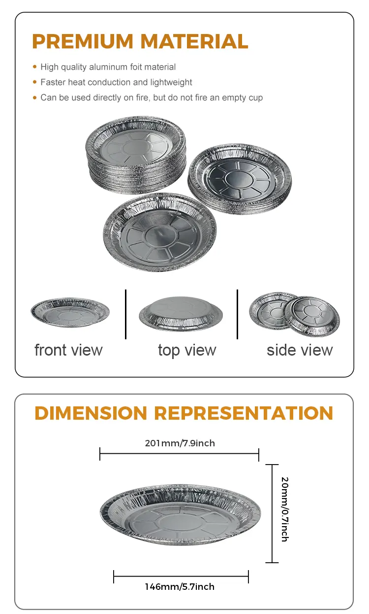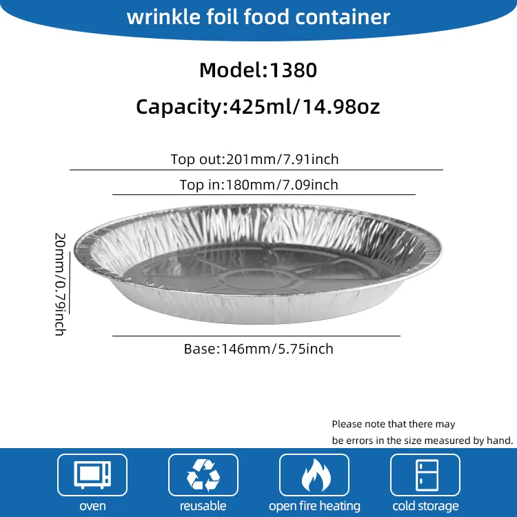 Yunchu alumiiniumfooliumist ühekordse kettaga õhufritüüri hõbedane alumiiniumfooliumist konteiner on nii hügieeniline kui ka keskkonnasõbralik. See on valmistatud paksendatud ja korrosioonikindlatest materjalidest, mis ei deformeeru kergesti ja võivad toiduga otseselt kokku puutuda. See ei karda kõrgeid temperatuure, ei põle, ei põle ja seda ei ole lihtne maha visata. See talub kõrgeid temperatuure kuni 250°C ja sobib erinevatele toiduvalmistamismeetoditele nagu kõrgel temperatuuril küpsetamine, ahi ja grill, seega pole põhjust muretsemiseks. Saadaval on mitu spetsifikatsiooni, et rahuldada erineva suurusega küpsetusvajadusi, võimaldades teil hõlpsasti toime tulla erinevate toiduainete tootmise nõuetega.