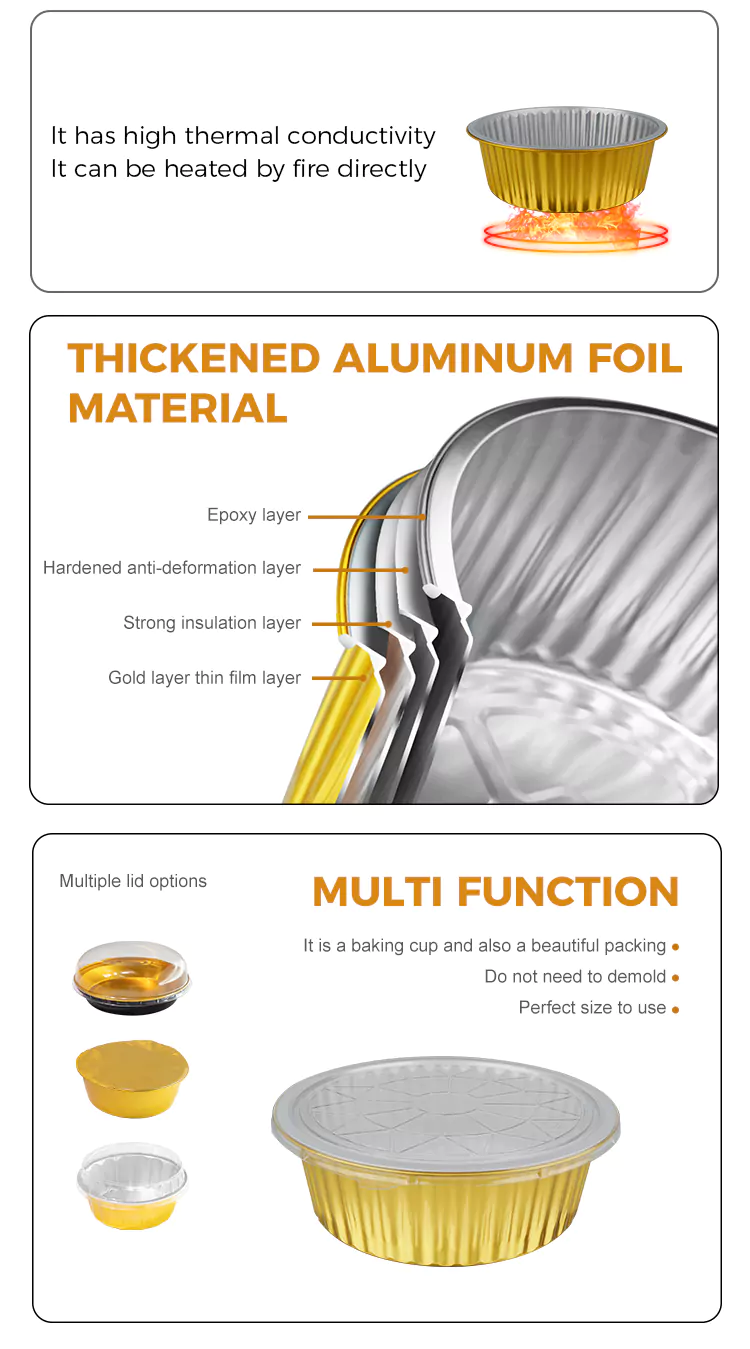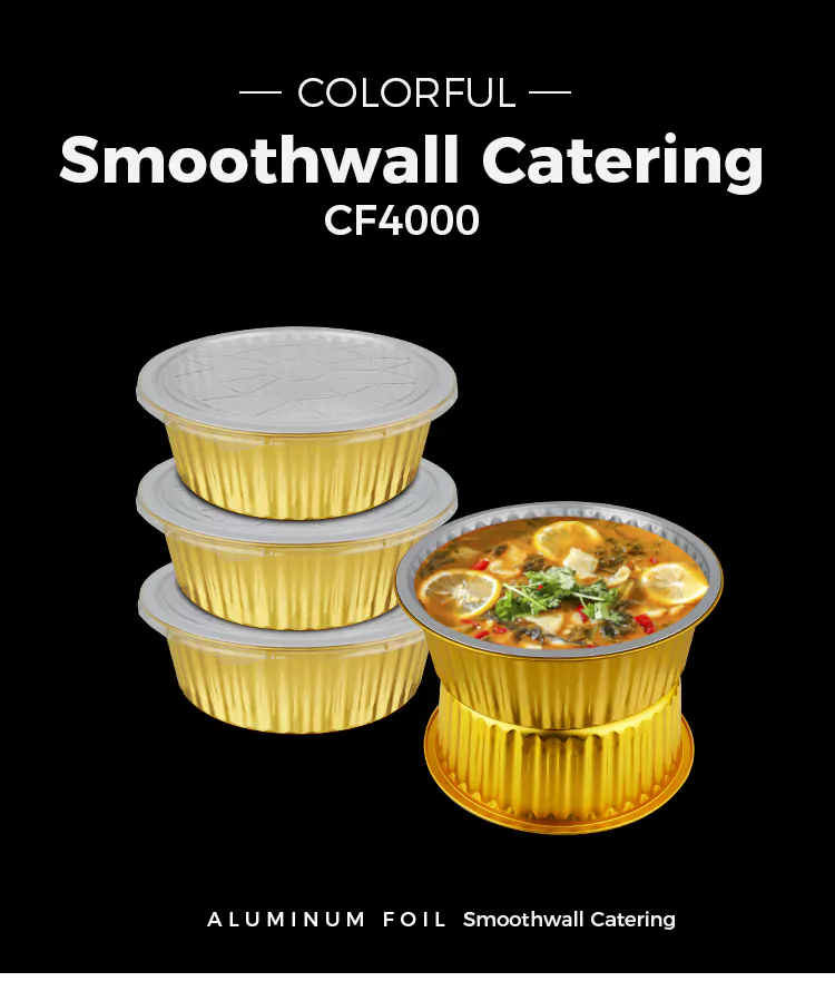 Yunchu alumiiniumfoolium tarnib teile kvaliteetseid ühekordselt kasutatavaid ümmargusi suure mahutavusega kullast alumiiniumfooliumist mahuteid. Oleme võtnud kasutusele pilkupüüdva välimuse, mis muudab need nii kõrge välimuse kui ka praktilisusega. Rakendusstsenaariumid hõlmavad kodukööke, toitlustusettevõtteid, küpsetusstuudioid jne.