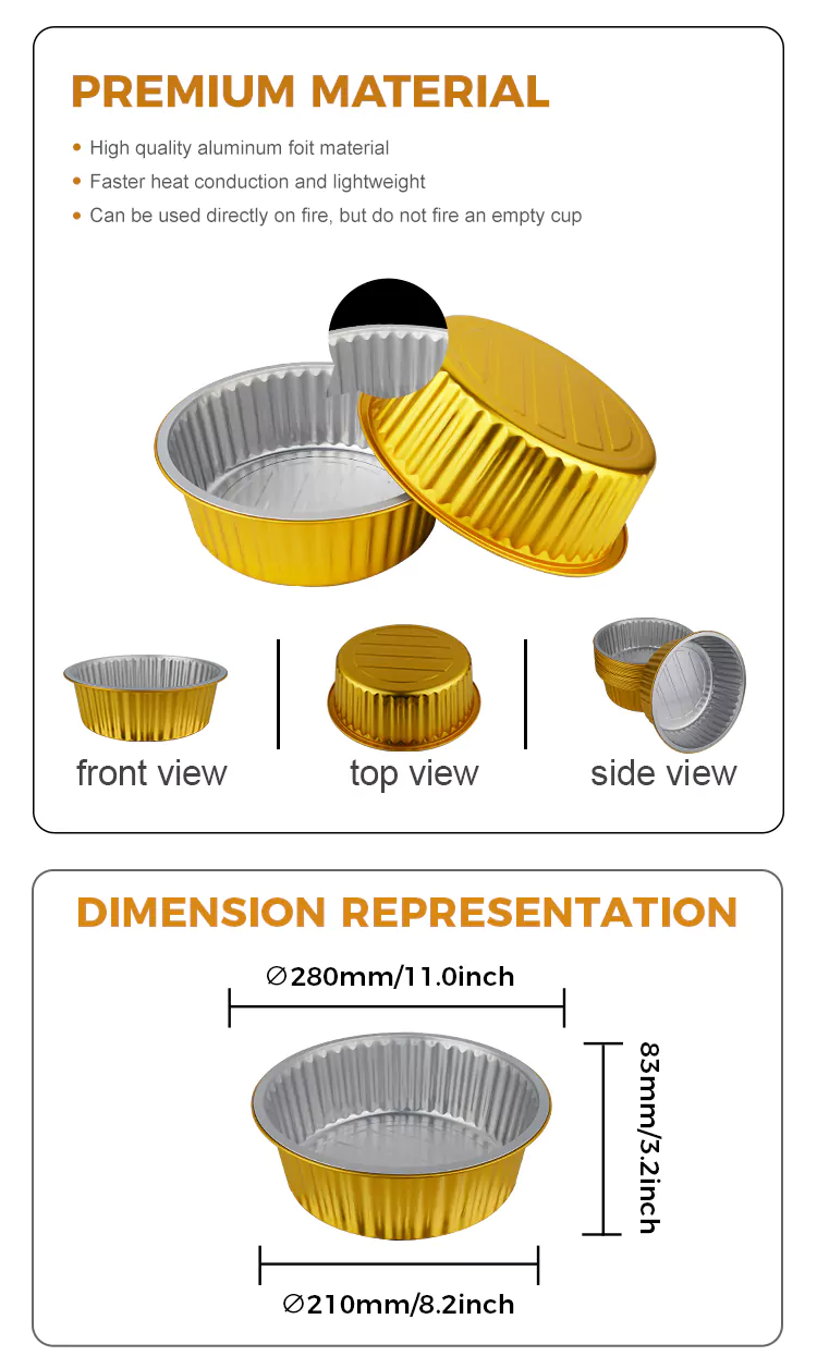Keskendume ühekordselt kasutatavate ümmarguste suure mahutavusega kullast alumiiniumfooliumist mahutite tugevuskujundusele. Seina paksus on teaduslikult proportsionaalne, et tagada nii paindlikkus lihtsaks vormimiseks kui ka piisav kandevõime. See ei deformeeru ega leki, kui seda kasutatakse suppide, roogade, küpsetiste jms hoidmiseks. Servad on töödeldud valtsitud servade protsessiga, mis tagab sujuva puudutuse, mis ei kriimusta kätt, muutes selle kasutamise ohutumaks. Pakume teie valikule erinevaid mahuspetsifikatsioone, alates minimagustoidukarpidest kuni peredele mõeldud jagamispakkideni, mis vastavad erinevate stsenaariumide vajadustele. Olenemata sellest, kas see on mõeldud kaasavõtmiseks restoranides, valmistoodete pakendamiseks pagaritöökodades või koduste hõrgutiste hoidmiseks, on neid kõiki lihtne kohandada.