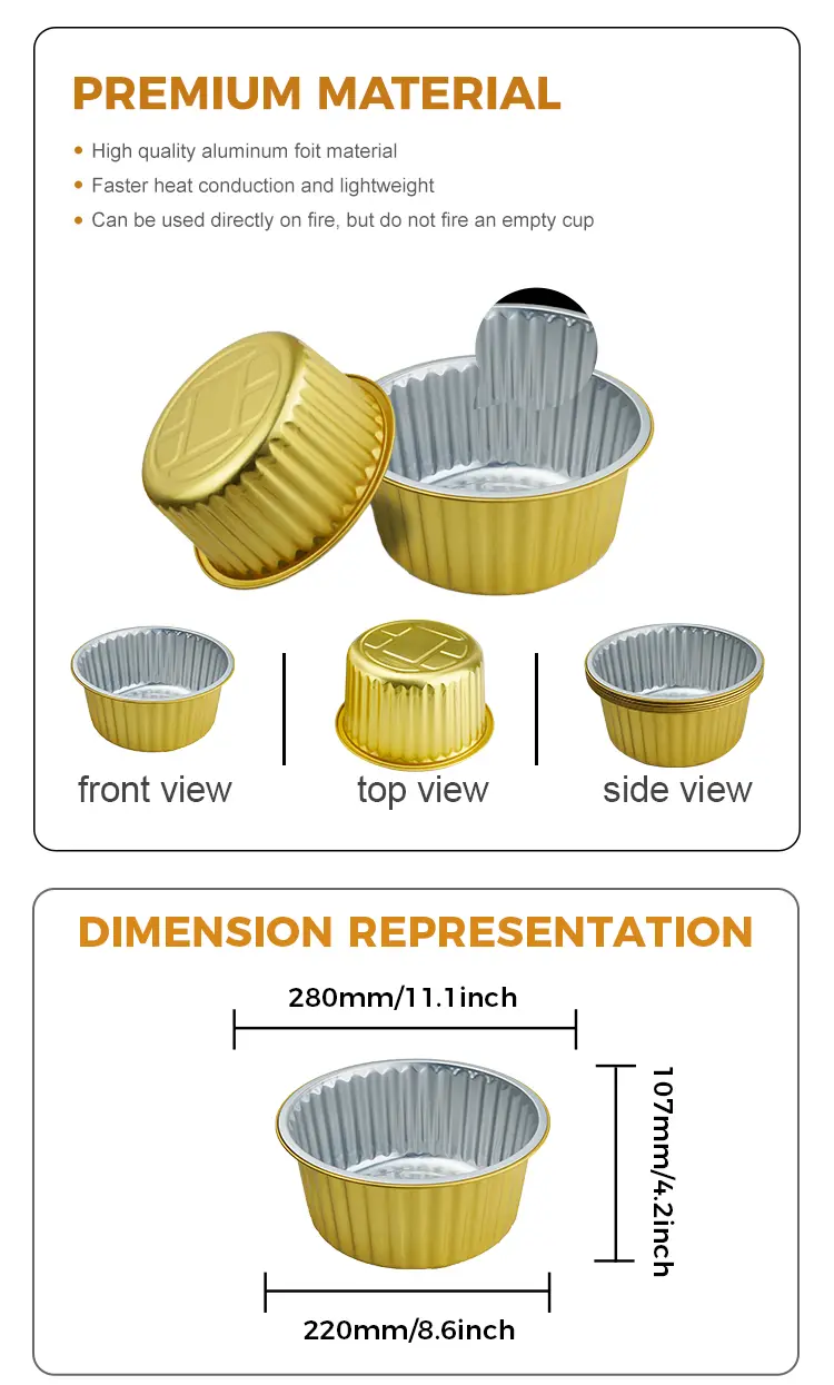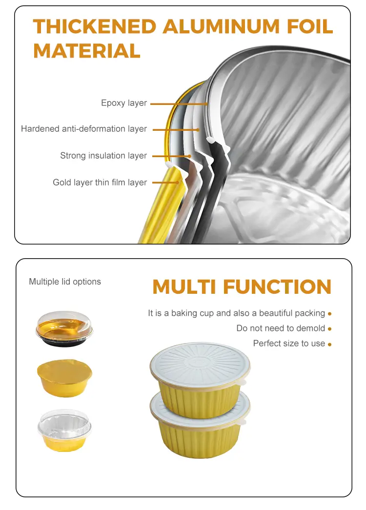 Yunchu tarnija See ühekordselt kasutatav tihendatav kuldne ümmargune alumiiniumfooliumi anumad võivad pakkuda kõrgtemperatuurilise vastupidava poolläbipaistva PP-kaane, lamineeritud kuumusega alumiiniumfooliumi kaane on valikuline ja kasutab tolmukindlat ja lekkekindlat ohutust, mis sobib ümardatavateks, mis sobib kõige enam, mis sobib ümardatavateks tükkideks, mis on sobivad, mis on sobivad. Suuremahuline toiduvalmistamine ja meil on kohandatud teenus, mis saab brändi identiteedi näidata logo, mustritrükki jne.