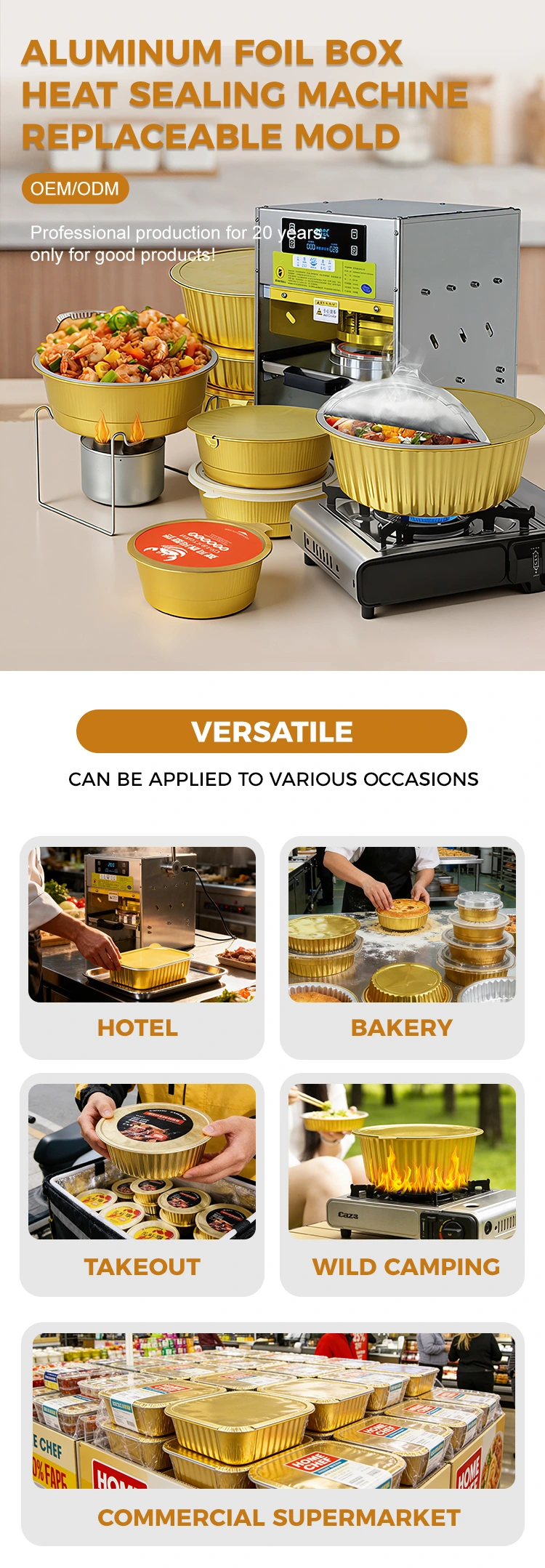 Yunchul on oma tehas ning ta toodab ja tarnib Hiinas kuldsete alumiiniumfooliumist konteineritega käsitsi kuumsulgemismasinaid. See kasutab toidukvaliteediga materjale ning on ohutu ja muretu. Valmistatud toidukvaliteediga alumiiniumfooliumist/PP materjalist, on läbinud autoriteetsed ohutustestid, on lõhnatu, vastupidav kõrgetele ja madalatele temperatuuridele (-20℃ kuni 220℃) ning seda saab otse mikrolaineahjus kuumutada, ahjus küpsetada või säilitamiseks külmutada, täites toidu mitmekesised töötlemise ja säilitamise vajadused ning pakkudes tarbijatele tugevat turvatunnet.