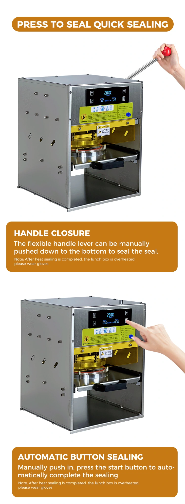 Tõhusam: pole vaja siduda eraldi tihenduskiledega. Lõunakarbid ja kuumsulgurid on kohe kasutusvalmis. Käsitsi kasutamine ei nõua eelsoojenduse ootamist. Väikeste partiide tellimusi saab kiiresti töödelda ja suuri tellimusi saab ka pidevalt edasi lükata. See saab hõlpsasti hakkama selliste stsenaariumidega nagu söögitundide tipptundide arv ja festivalitellimuste järsk tõus.