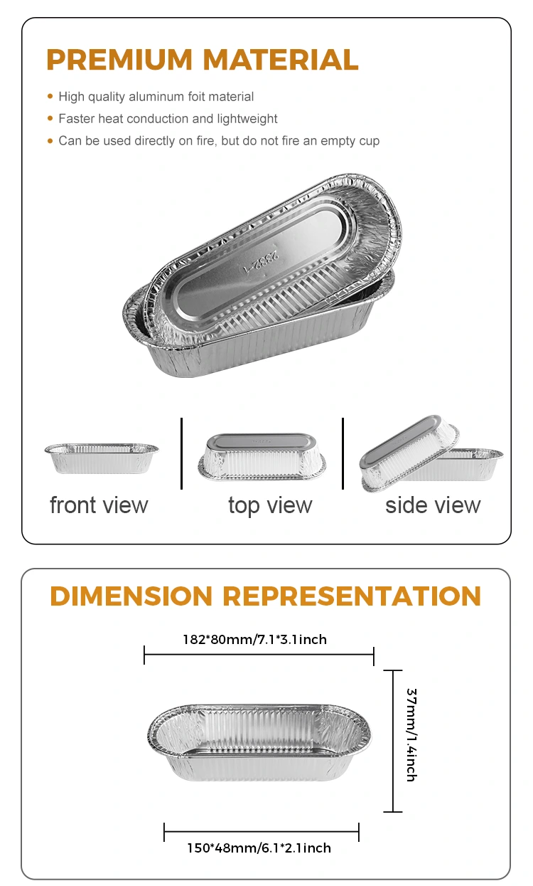 Yunchu alumiiniumfooliumitarnija ovaalne õhu praepann hõbeda fooliummahuti sobib erinevatele kohtadele, näiteks toitlustamine, koduõhu praepannisti valmistamine, kaasavõtmine, buffet -kaste, bankett jne. See sobib ka munade, šokolaadide, küpsiste, väikeste kookide, sakide ja muude toitude aurutamiseks. Ükskõik, kas seda kasutatakse toidu või kastmena, saab seda anumat kasutada paljudes toidu- ja joogitööstustes. Lisaks saab seda siduda küpsetistega ja väikest fooliumtassi pole mitte ainult lihtne kaasas kanda, vaid lisab roogile ka ilu. Pärast kasutamist pole seda vaja puhastada ja selle saab otse ära visata, muutes selle kasutamise väga mugavaks.