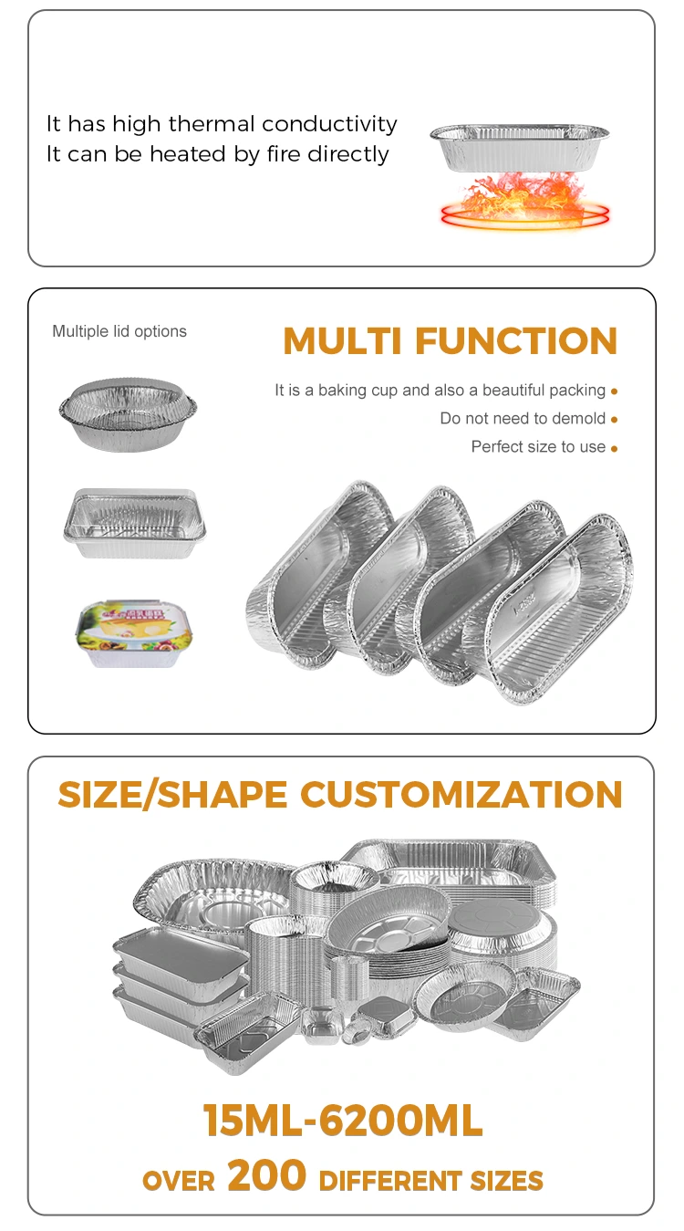 Yunchu alumiiniumfooliumitarnija ovaalne õhufüür küpsetab hõbedaseid alumiiniumfooliumi anumeid, mida saab kasutada aurutamiseks, keetmiseks, küpsetamiseks, küpsetamiseks ja muudeks otstarbeks ning mida saab kasutada kastmete, kastmete kastmise, väikeste ülemõõtmeliste ja küpsetusproovide proovide jaoks. 8011-0 Tüüp alumiiniumfooliumi materjal, tõmbetakistus ja korrosioonikindlus on hea pikenemine, paksenenud alumiiniumfooliumi materjal, vastupidav ja seda pole tahtmise korral kerge murda, eesmine ja tagumine poolringi kujundus ei kahjusta käsi, integreeritud vorm, seinapind on sama sile kui peegel, mis sobib mitmesuguses stsenaariumis.