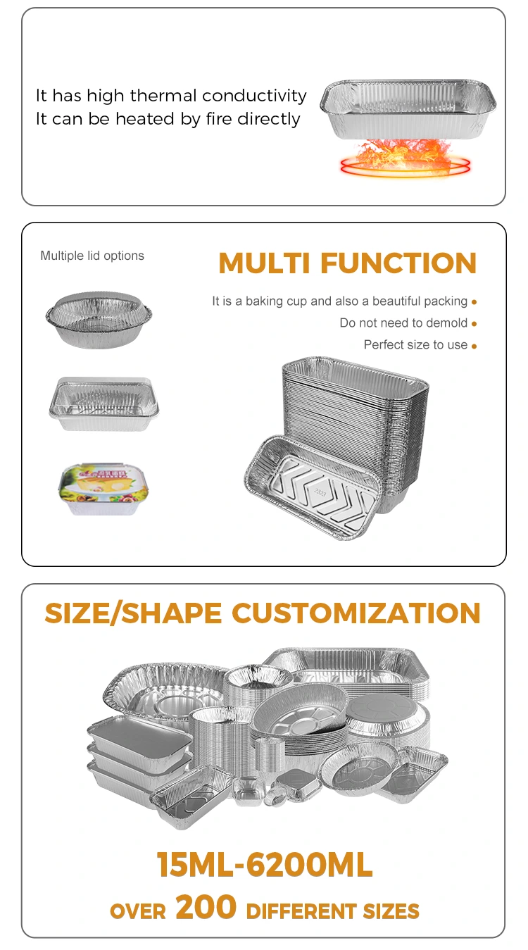 Omadused: Lõunakasti hulgimüük 8011 alumiiniumfooliumi materjal on valmistatud heast soojuse säilitamisest, mis võib säilitada toidu temperatuuri ja muuta toidu maitsvamaks. Lisaks on meie ristkülikukujulisel grillil hõbedase alumiiniumfooliumi konteineril ka soojuse säilitamise funktsioon, mida saab sobitada alumiiniumfooliumi paberi kaane ja lemmiklooma plastist kaanega, mis on teile mugav oma logo kohanemiseks, kliendi veelgi süvendamiseks ja oma brändipilti täiustamiseks.