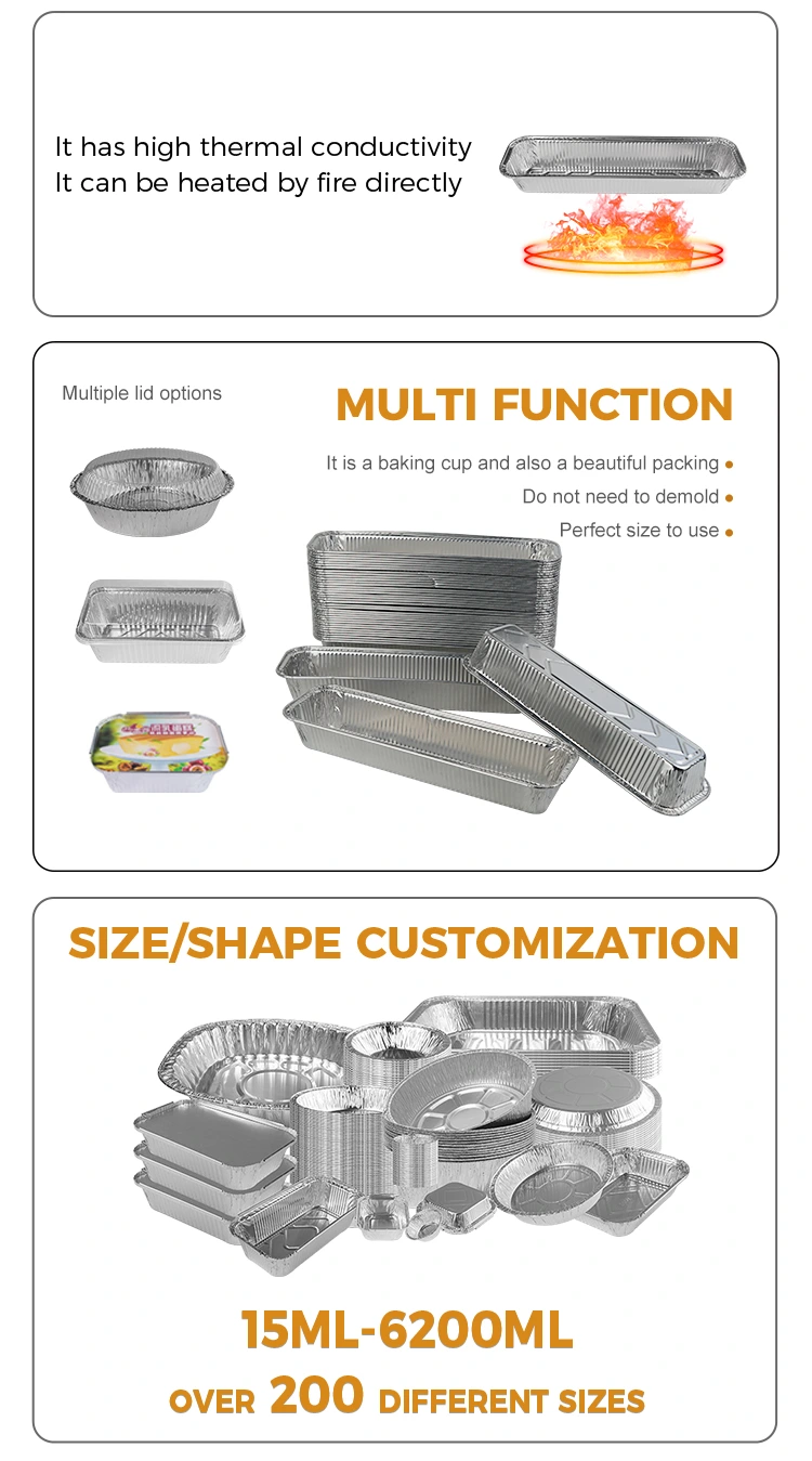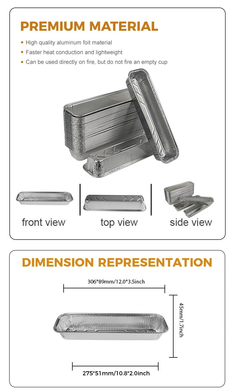 See ristkülikukujuline leivaaluse küpsetamine hõbedase alumiiniumfooliumiga konteinerid läbivad range kvaliteeditesti, et tagada, et lahtise leegi kuumutamise ajal ei vabastata kahjulikke aineid, ja kasutajad ei pea ohutusprobleemide pärast muretsema. Lisaks ei taga selle keskkonnasõbralik ja vastupidav disain mitte ainult toodete ohutut transportimist, vaid säilitab ka parima välimuse. Põhjas nõgus ja kumer disain suurendab toote libisemisvastaseid omadusi, samas kui külgedel olevad lisatud jäigad suurendavad toote kõvadust. Heitmi kujundus on paksenenud ja süvenenud, hea kõrge temperatuuri ja soojusjuhtivusega, mis võib saavutada ühtlase kuumutamise ja omapärase lõhna, muutes selle kasutamiseks mitme stsenaariumi jaoks, näiteks söe grillimine, pikk leib ja kaasavõtmine.