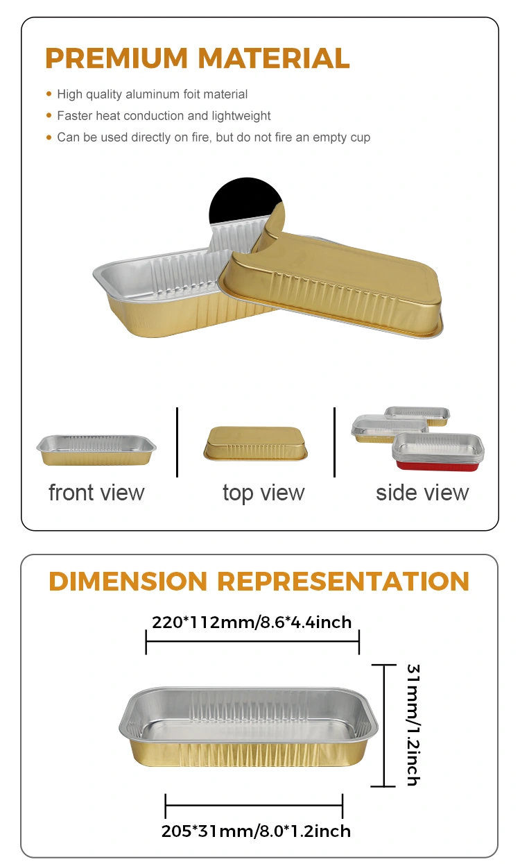 Alates küpsetamisest ja tootmisest kuni esitlemise, ladustamise ja väljaviimiseni on ristkülikukujulistel kuldsetel Smoothwall alumiiniumfooliumist anumatel kaks eelist: välimus + tugevus, mis võimaldab igal maitsval toidukorral jõuda kasutajateni rafineeritumal ja turvalisemal viisil. Valige see, et küpsetamine poleks ainult maitsenauding, vaid ka igakülgne visiooni ja kogemuse täiendus!