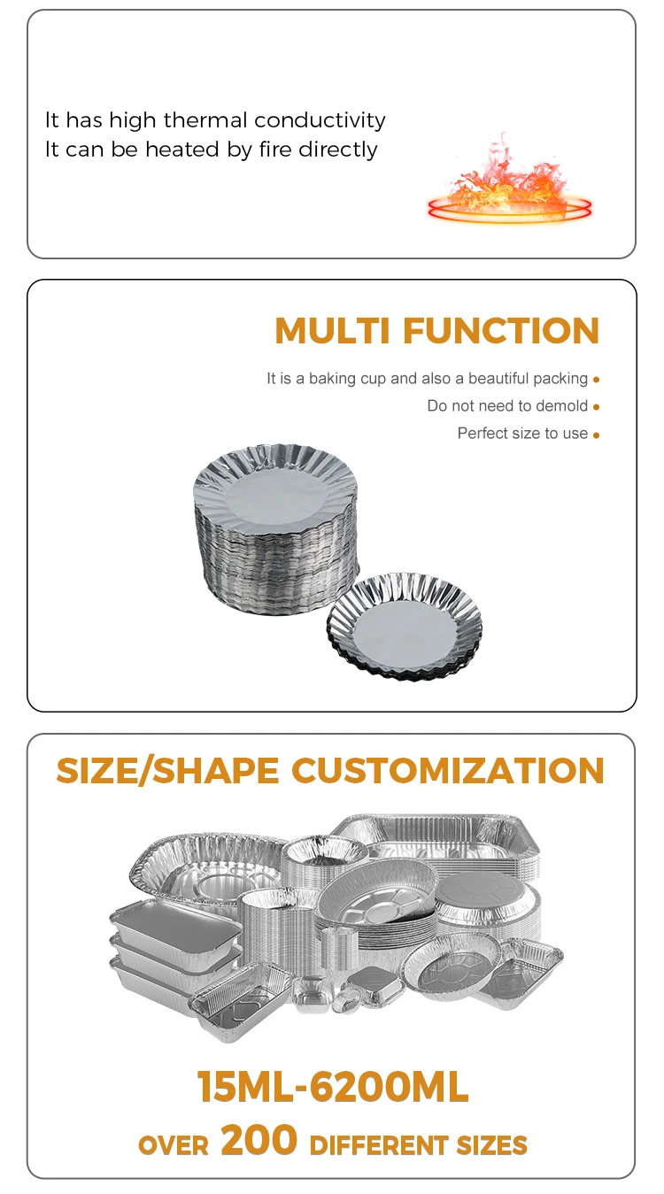 Yun Chu alumiiniumfooliumi tarnija poolt ümmargusel alumiiniumfooliumiga toidumahutiga küpsetuskoog tina on väga läbimõeldud disain. Need on ümmarguse kuju ja mõõduka suurusega, mis sobib erinevat tüüpi kondiitritoodete valmistamiseks, hõlbustades samal ajal ka lõikamist ja kaunistamist. Lisaks arvutatakse paksus teaduslikult, et pakkuda piisavat tuge, et hoida toitu paigal, vältides samas liigset survet, mis võib toidu deformeeruda või praguneda.