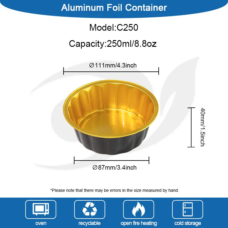 Yunchu alumiiniumfooliumi tarnija ümmargune kauss magustoiduks sileda seina alumiiniumfooliummahutite jaoks C250 on multifunktsionaalne toode, mis on mõeldud küpsetamiseks, toitlustustööstuseks jne, toode sobib küpsetamiseks ja pakendamiseks kookide, magustoitude, ümmarguste leivate, hamburgerite ning muude küpsetiste ja toitlustuskohtade küpsetamiseks ja pakendamiseks. Klanitud, ümardatud, nõgus ja kumer seinakujundus mitte ainult ei suurenda praktilisust, vaid suurendab ka toote ilmet ja tunnet ning toidu ühtlase kuumutamise ja libisemiseta jõudluse tagamiseks on mitmesuguseid lemmikloomade läbipaistvaid ja fooliumi kaaneid.
