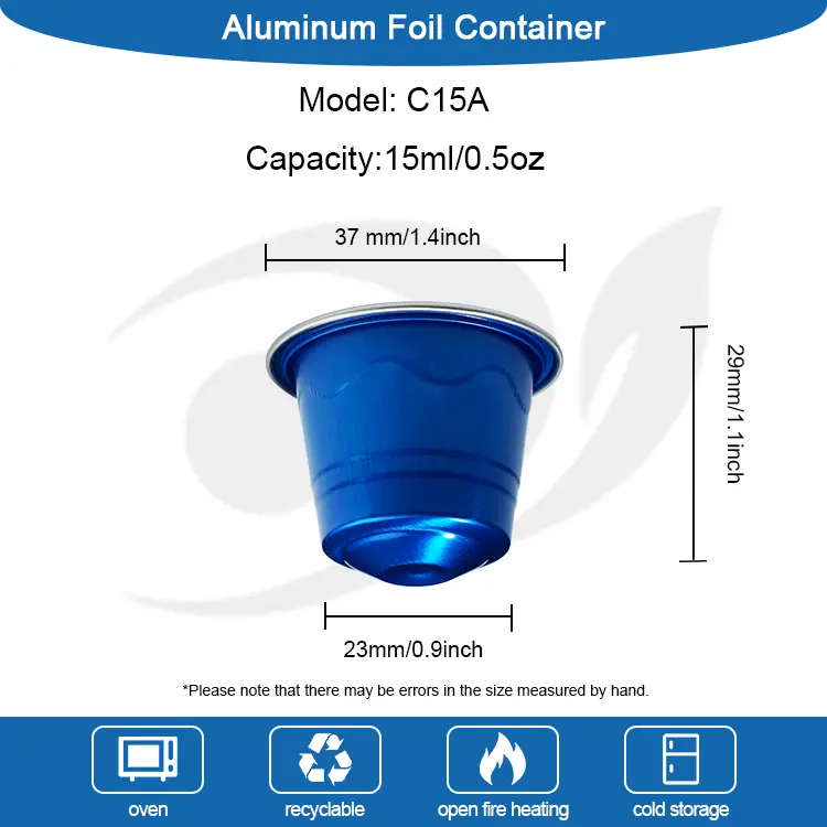Yunchu alumiiniumfooliumitarnijad pakuvad C15A koonilist silikoontasevaba tühja kohvikapslit, mis sobib enamiku kohvikapsli masinate jaoks, mida saab kasutada espresso vedeliku pakendamiseks ja isegi pikendada säilivusaega lämmastiku loputamisega. Lisaks saab logo ja värve kohandada ning alumiiniumfooliumi tihendile saab mustreid printida ning kapsli põhjas saab teha ka logo tembeldamist. Kapsli mõõtmed on järgmised: ülemine läbimõõt 37mm (umbes 1,4 tolli), aluse läbimõõt 23mm (umbes 0,9 tolli), kõrgus 29mm (umbes 1,1 tolli).