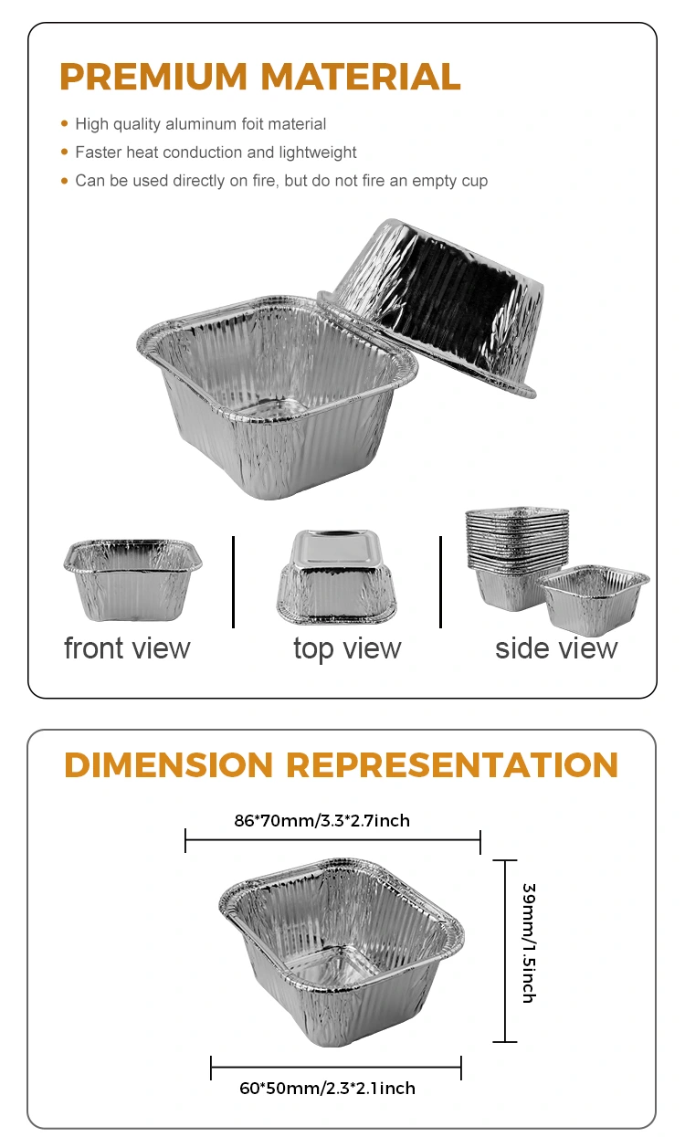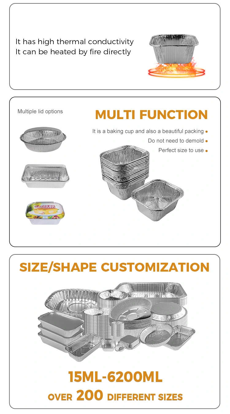 Yunchu alumiiniumfooliumi tarnija pakutav ruudukujuline küpsetuspanga õhufüülfooliumi anum sobib mitmesugusteks puhkudeks, sealhulgas õhufüünid, väikesed küpsetusahjud, toitlustusahjud ja kohvik. See ei sobi ainult austri vermicelli, magustoidupunaste ubade, grillitud kana tiibade ja aurutatud kookide valmistamiseks, vaid seda saab ka mitmesuguste koostisosadega siduda ja seda kasutatakse laialdaselt toitlustuse valdkonna kõigis aspektides. Konteineril on mittekleep ja õmblemisvastane disain, millel on nõgus ja kumera põhjakonstruktsioon, mis hõlbustab toitu hallituse vabastamise ja parema välimuse säilitamise. Ükskõik, kas see grillib või aurutab üle avatud leegi, saate sellega hõlpsalt hakkama ilma, et teid piirata. Selle materjal on vastupidav ja vastupidav, muutes selle sobivaks mitte ainult ahjudes ja õhu praepannides, vaid ka avatud leegigrillides või aurutites, mis on mugav ja kiire. Lisaks on anuma pind sile ja tasane ning servad on ümardatud ja neid pole kerge kriimustada ning isegi kui on voldid, ei mõjuta see haardumist. Pakume mitmekesiste vajaduste rahuldamiseks mitmesuguseid pannikujusid, sealhulgas ruudukujulisi, ümmargusi ja südamekujulisi stiile. Kui olete huvitatud, pöörduge lisateabe saamiseks meie klienditeenindajate poole.